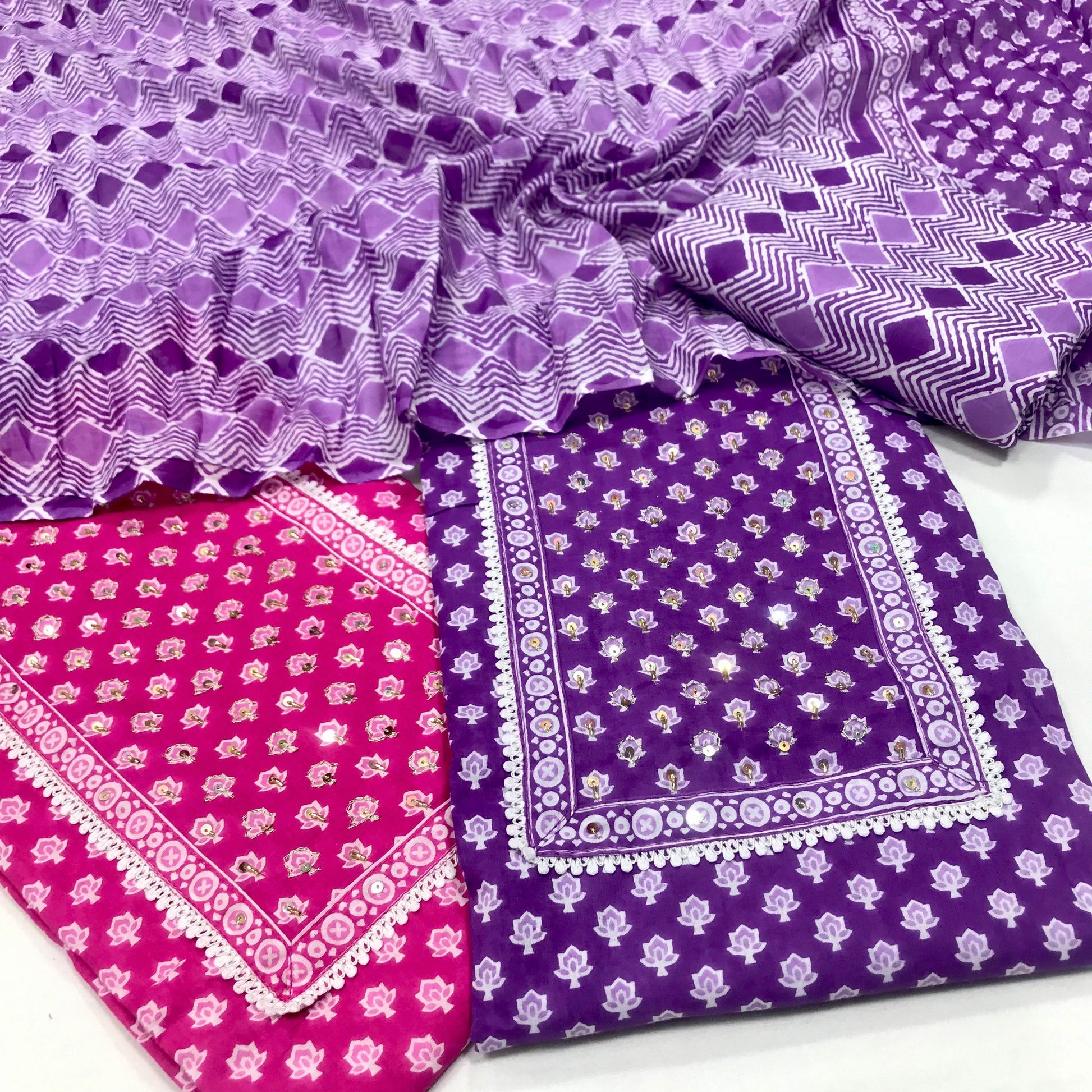 - Beautiful print with zari sequence & Cutdana worked cotton shirt along with printed cotton dupatta with zigzag print cotton bottom.